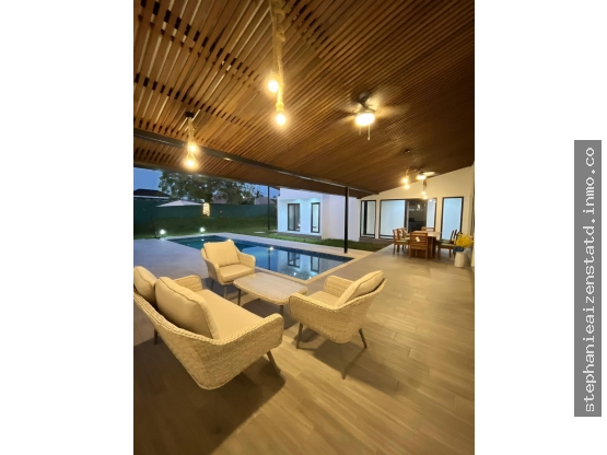 En el área social, disfruta de una piscina con jacuzzi frío e iluminación LED, rodeada de áreas verdes y estacionamiento para 4 vehículos.